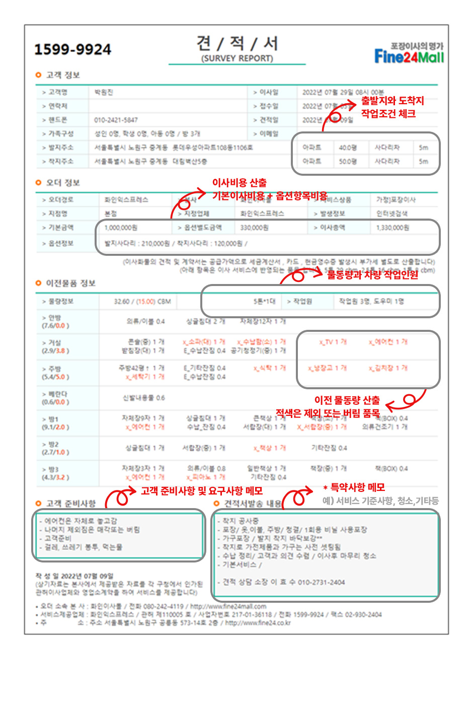 이사전문 상담직원이 고객과 통화 또는 사진 및 영상을 참고로, BTN시스템에 저장된 500여개의 그림을 클릭하여 구역별 물동량을 산출하고, 총이사비용을 핸드폰으로 제출하는 견적방식입니다.
